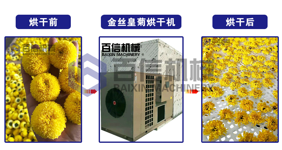 金絲皇菊烘干機脫水干燥迅速, 操作方便運行,金絲皇菊干燥設備廣泛應用于食品(如面條、面皮)、干果(大棗、巴旦木、腰果、開心果)、花茶(玫瑰花、菊花、金銀花、百