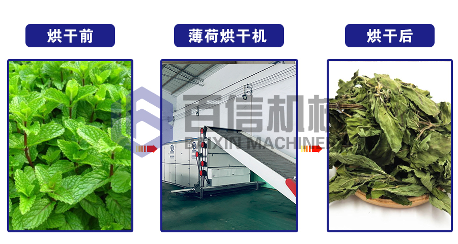 使用百信薄荷葉專用網帶式薄荷葉烘干機干燥過的薄荷葉色澤好,破損率低,收益高。可根據生產需要對網速、溫度和濕度進行調節,以滿足對不同含水率、不同品種的薄荷葉進行烘干處理。