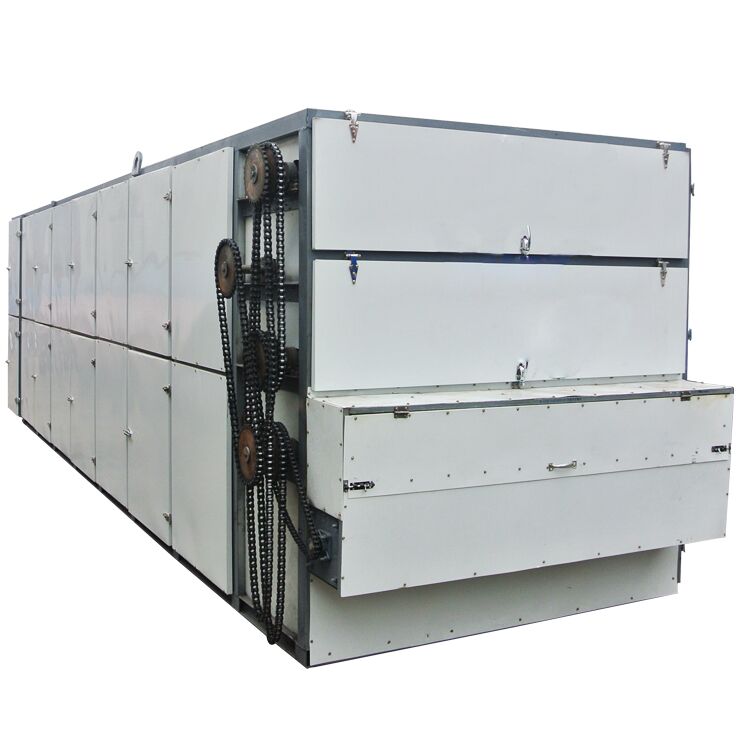 薄荷葉從*上層進入,薄荷葉鋪料厚度由自動鋪料器控制,在網帶的帶動下,薄荷葉從上層往下層移動。運行中,薄荷葉有多次往下落的過程,使薄荷葉翻動更透徹、干燥更均勻。干燥好的薄荷葉從底層的出料口排出,在此過程中充分和高溫熱空氣充分接觸,達到干燥的效果。
